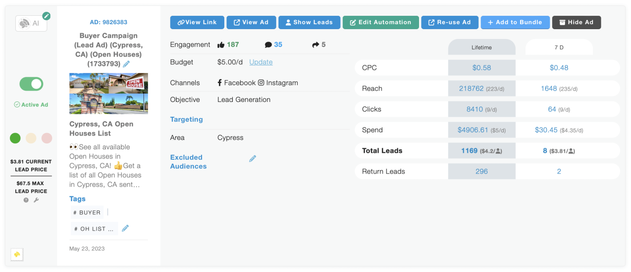 First, it’s normal for a good ad to last a long time. In fact, one agent using StreetText, Chase Whitney, launched an ad in 2023… and it’s still running awesome today. (See the image below.) It is generating leads and winning at the ad auction. You’ll notice that lead cost is actually improving!